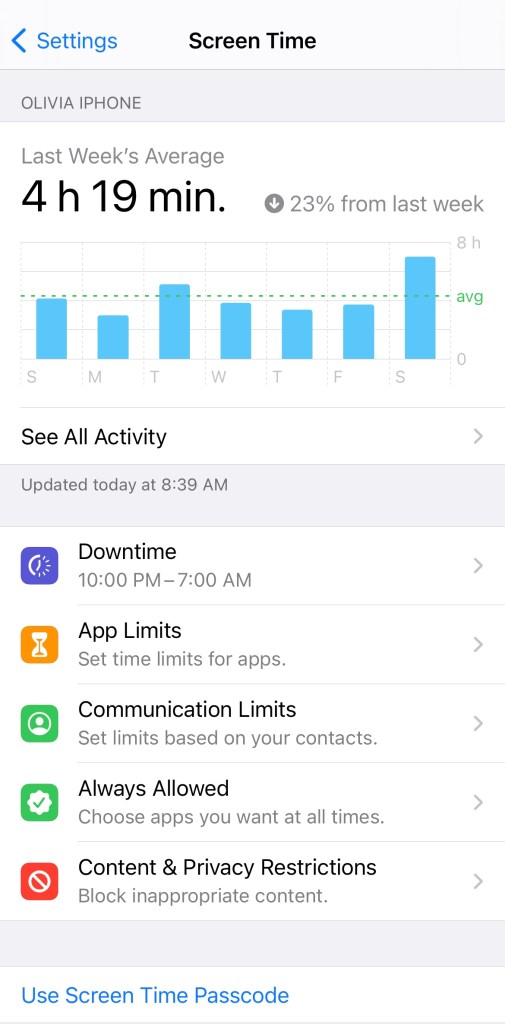 In the Screen Time you can also set communications and time limit, as well as content & privacy restrictions. If your children have an iPhone or you share your iPhone with them, I recommend setting up the content & privacy restrictions and using a screen time passcode.
