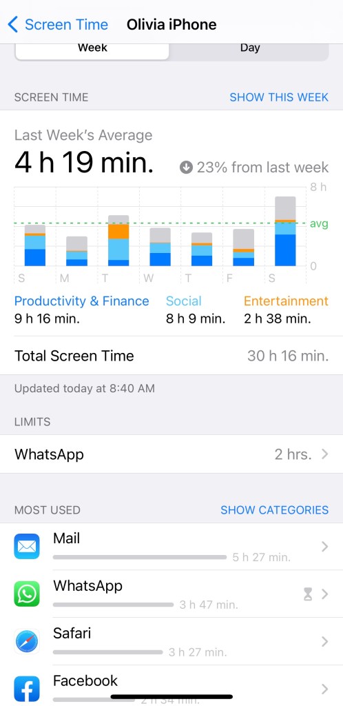 Every Sunday morning, I get a weekly report of my screen time. The following screenshot is my screen time the week of April 18th to April 25th