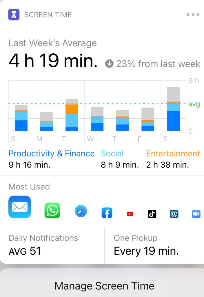 4. Understanding my phone screen time on my phone setting and time management to keep me accountable. Here’s a screenshot of my iPhone screen time the week of April 18, 2021. This report tells me how much time I spend on my phone, my screen time activities, the number of times I pick up my phone, as well as my average notifications.